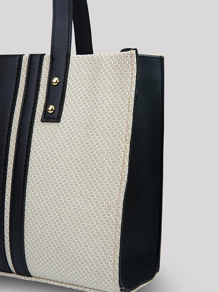 Chic Vertical Stripe Design: A modern, eye-catching pattern of black faux-leather stripes set against a natural-weave body.